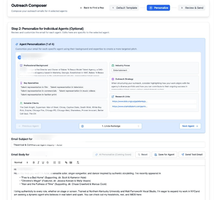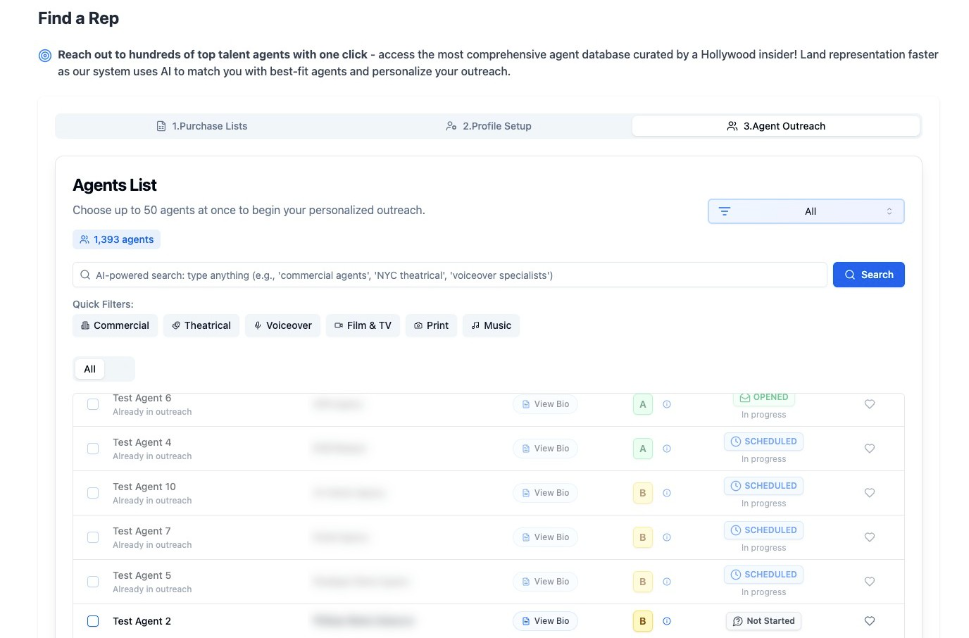 Find a Rep lets you reach out to hundreds of top talent agents with a single click — powered by AI, backed by Michael Masini, our new Industry Advisor and working actor, and built to get you real traction through the most comprehensive agent outreach system in the industry.