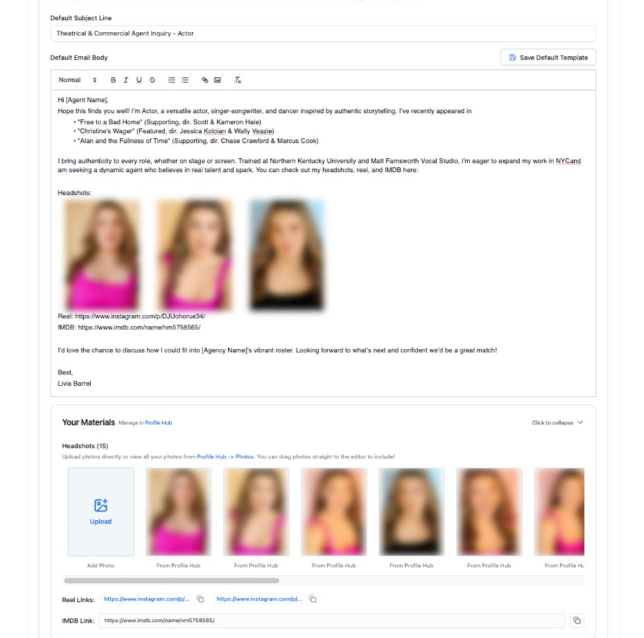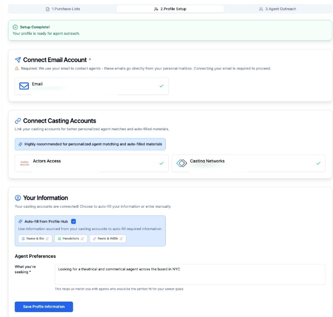 ✨ Effortless matching, zero setup stress. Your headshots, reels, and credits — auto-filled and sent to the right agents. You just click.