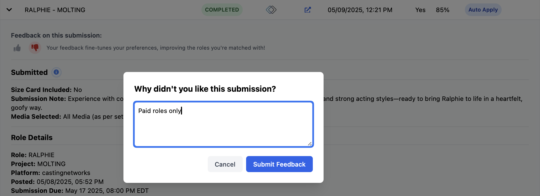 ...It made the audition process so much easier for me, especially since I tend to forget to log in daily. Knowing submissions were happening automatically gave me peace of mind and helped me stay more consistent and actually gave me callbacks (which I hadnt seen in a while)